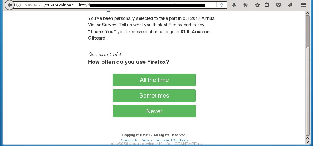 Небольшой опрос, который показывает сайт play3955.you-are-winner10.info, есть ни что иное как вид вводящей в заблуждение рекламы. Чтобы вы не выбирали, какой ответ не вводили, результат один. Вам будет показана страница с как бы бесплатными товарами. Товары как бы бесплатные, но чтобы их получить нужно заплатить деньги или ввести свои реальные контактные данные, которые в дальнейшем могут быть проданы или переданы третьим лицам.